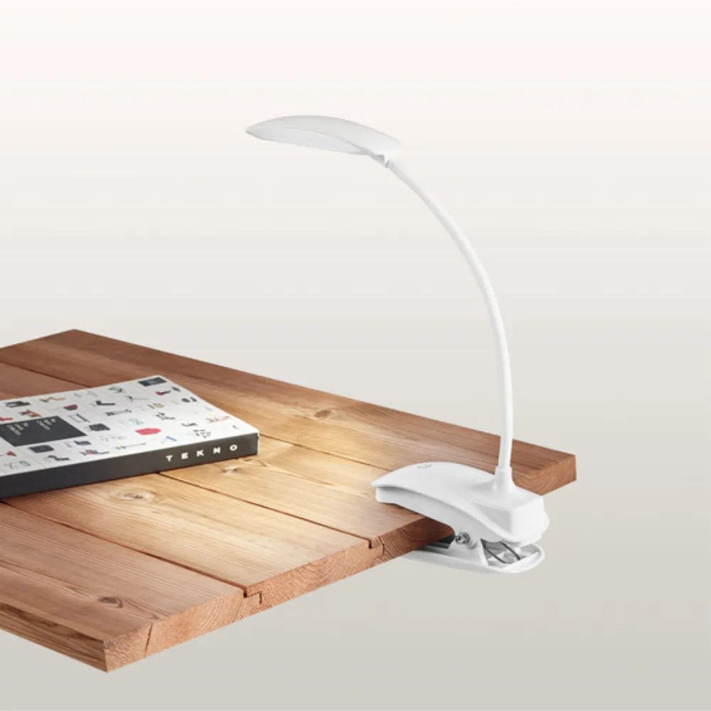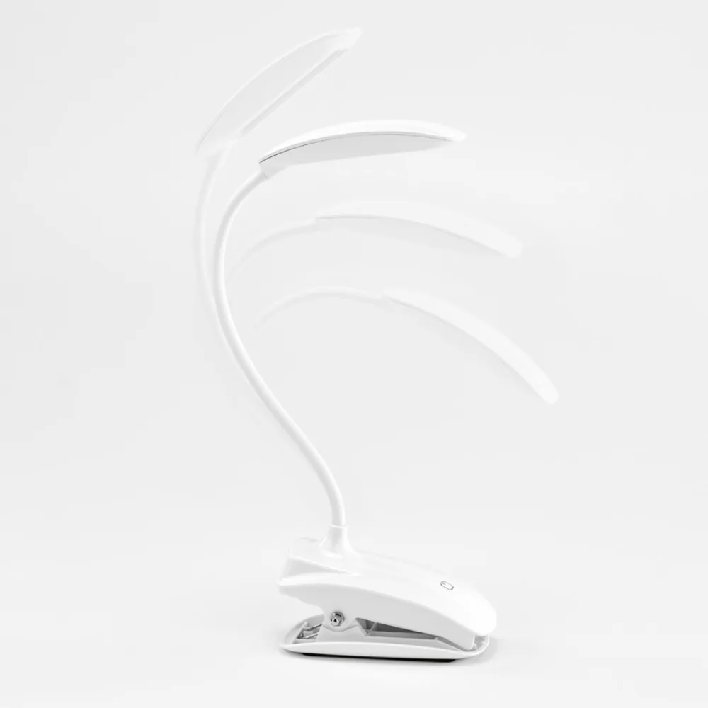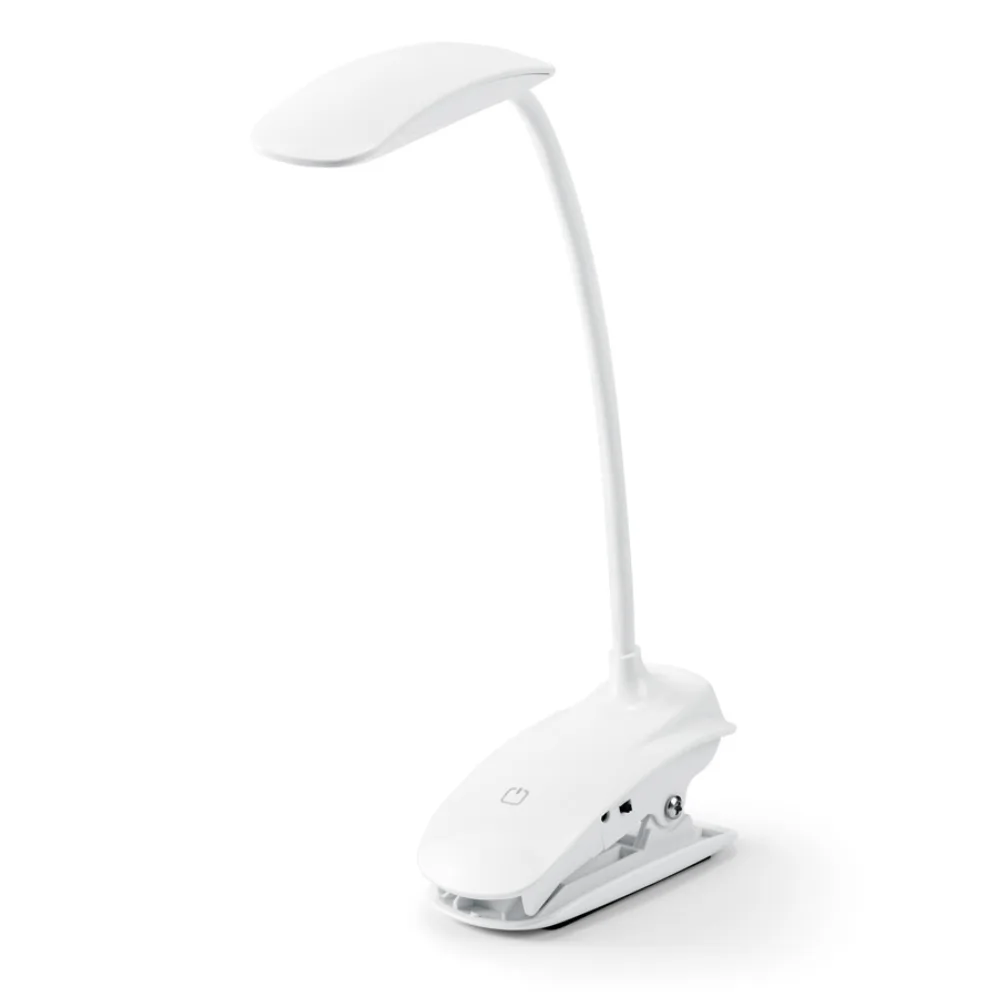 Luminária de mesa portátil em ABS e com LED COB personalizada para brindes. A luminária tem mola, braço flexível e botão tátil com 3 modos de luz (fraco, médio e forte). Autonomia até 20 horas. Incluso cabo USB de 1 metro para carregamento.