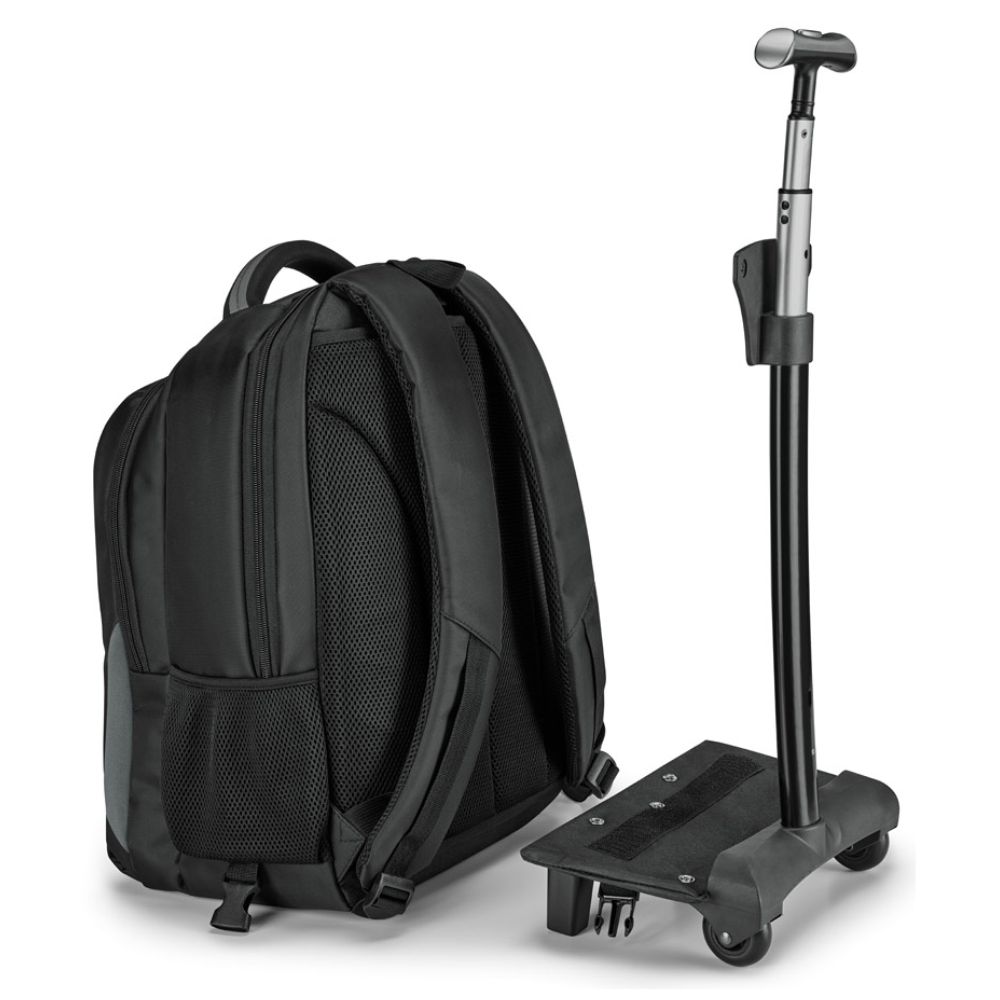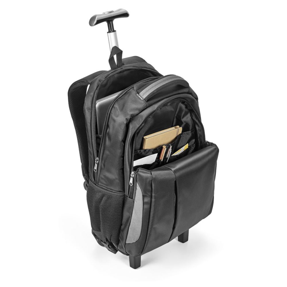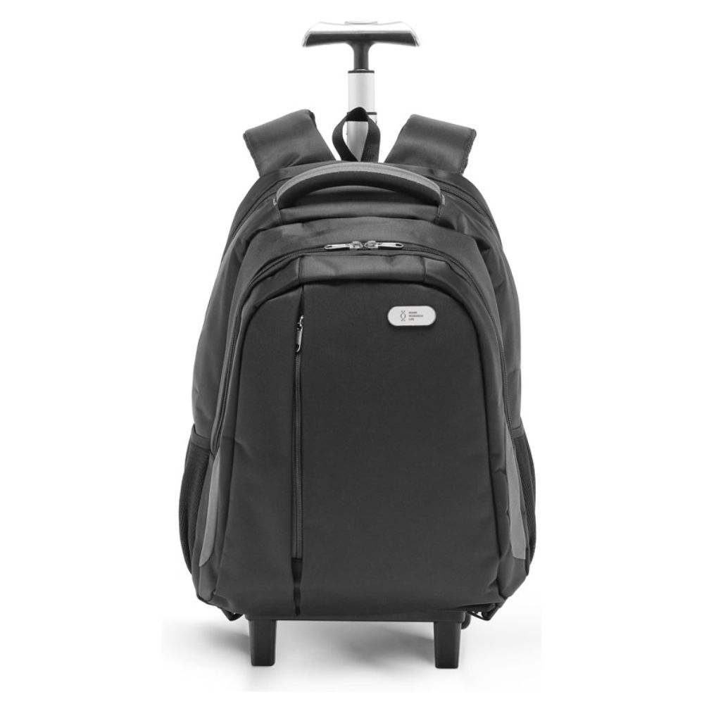 Mochila trolley para notebook em Nylon 999 impermeável com 2 rodas. Compartimento principal almofadado para notebook até 17''. Segundo compartimento forrado e com diversos bolsos. Bolso frontal com zíper e bolsos laterais com tela. O trolley tem protetor de rodas, estrutura removível, parte posterior e alças almofadadas e pega extensível em alumínio, com mola (altura da pega estendida até 550 mm). Placa metálica removível com imã, para fácil gravação. Capacidade até 30 L e peso de 1,70 kg. | Placa: 50 x 20 mm